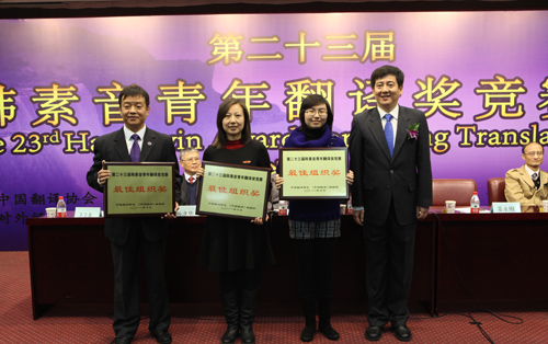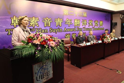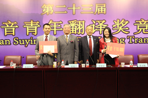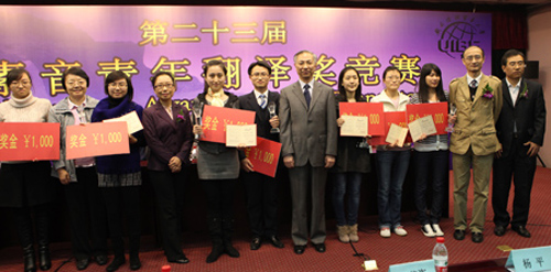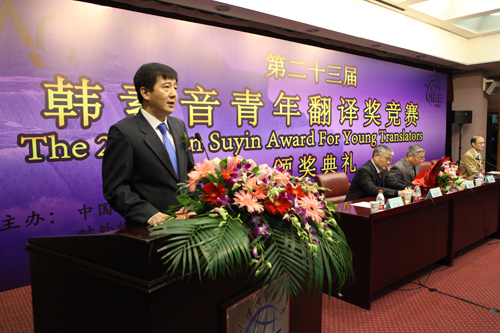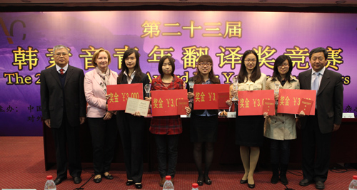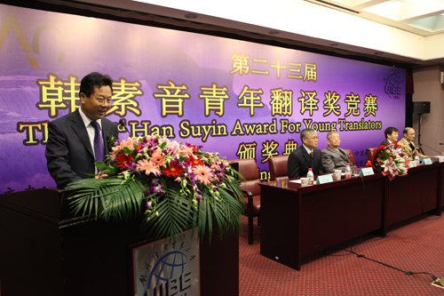 2011年10月29日上午,第二十三届“韩素音青年翻译奖”竞赛颁奖典礼在对外经济贸易大学举行。全国人大外事委员会主任委员、中国翻译协会会长李肇星,商务部(原对外经济贸易部)前副部长沈觉人,对外经济贸易大学校党委副书记杨逢华,中国译协常务秘书长姜永刚,中国商务部国际经贸关系司副司长孙元江等出席颁奖典礼,并为获奖选手和最佳组织奖获奖单位颁奖。此次竞赛评审委员会的主要专家学者,此届竞赛获奖者和相关方面的代表也参加了颁奖典礼。