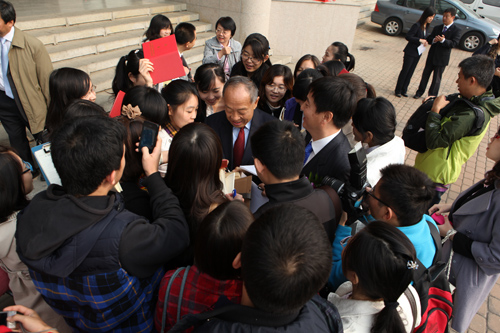 竞赛获奖者簇拥着呈上获奖证书请李肇星先生签名留念