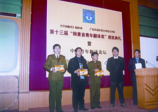 广东外语外贸大学陈建平副校长和《中国翻译》杂志副主编杨平女士为本届竞赛汉译英一等奖获得者、南京解放军国际关系学院的郑宇颁奖